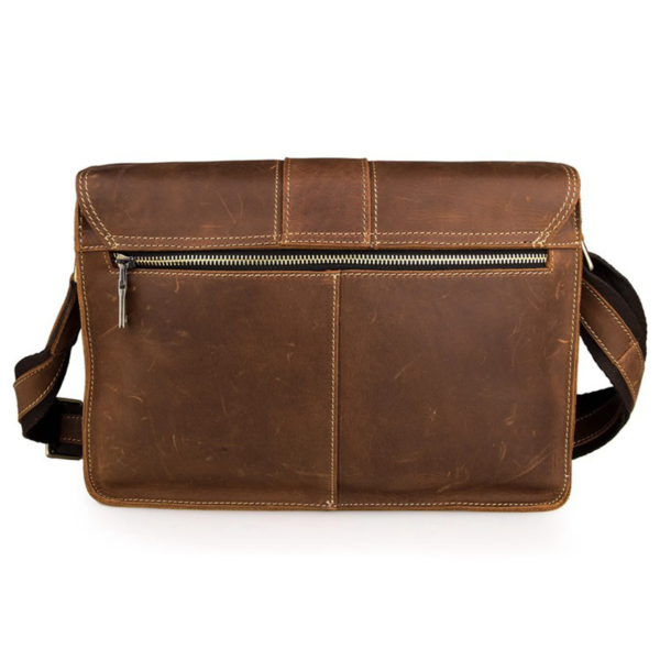 The bag closes with a large, fold-over leather buckle that never betrays your style. A rear storage compartment and sturdy shoulder strap complete the look.