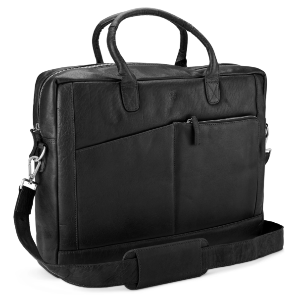 Made of finely stitched genuine black leather that stands the test of time and ages beautifully with time and use. The exterior features a large zippered pocket on the back and front. Padded handles and a removable, adjustable shoulder strap make carrying easy and comfortable. Strong YKK zippers protect the contents.