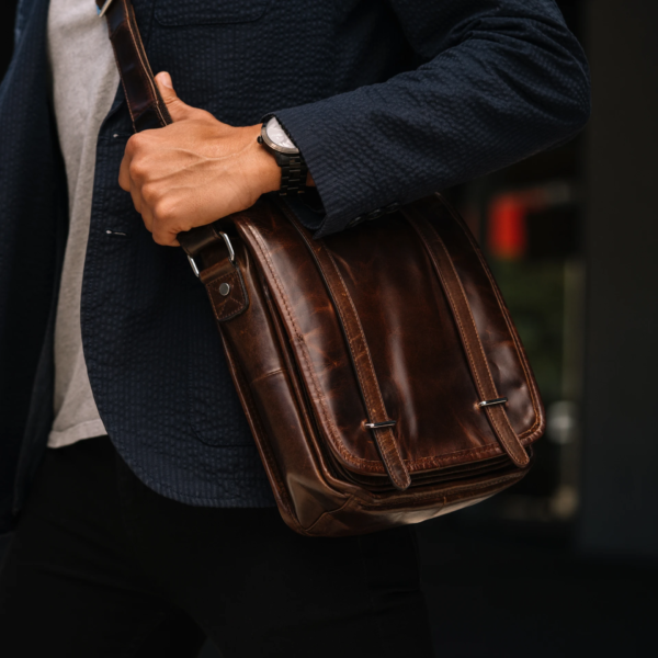 The leather is treated so that it has a dark brown color, but at the same time contains defects and textures typical of leather.